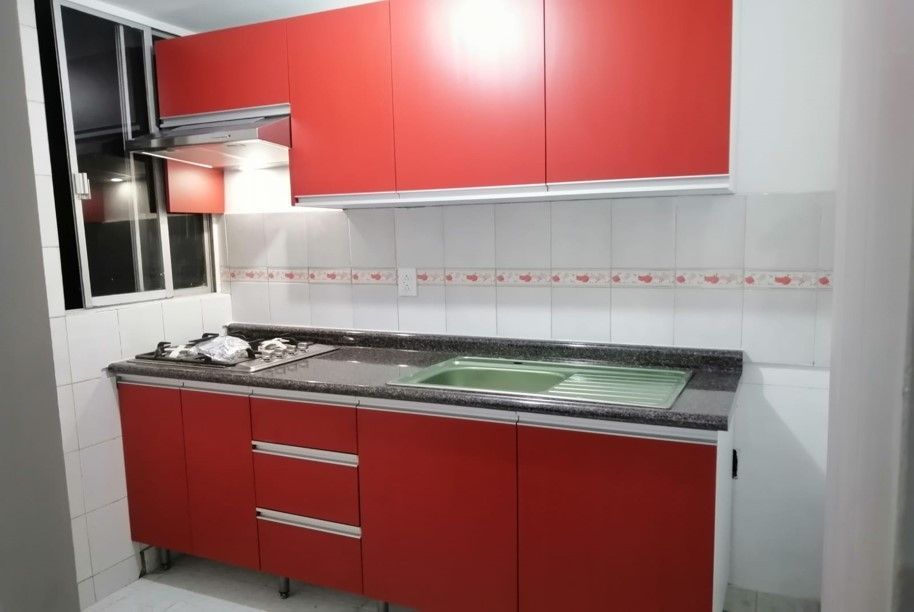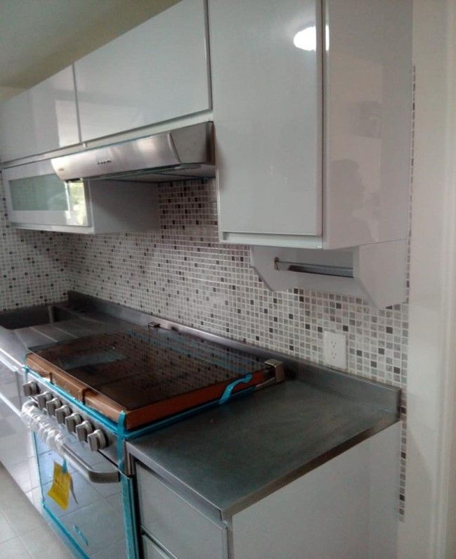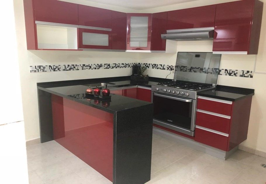 Cocina integral en alto brillo MDF, gran variedad de colores a elegir. Cubierta de granito importado. Cuenta con un diseño funcional con barra. Una buena elección para la cocina de la familia.